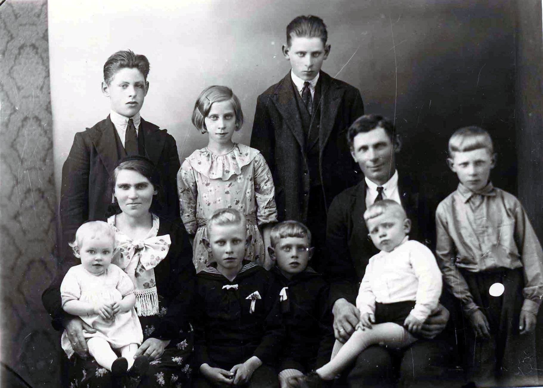 Guðjón Jónsson á Reykjum og Bergþóra Jónsdóttir og börn, aftari röð. Fr. v. Guðmundur, Jóhanna, Jón Óskar og fremri röð Fr. v. Lilja, Þorleifur, Magnús, Þórhallur Ármann og Guðbjörn Guðjónsbörn frá Reykjum v/ Vestmannabraut 54
