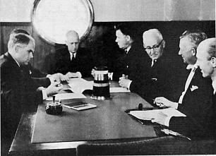 Samningur undirritaðir. Frá vinstri: 1. Magnús H. Magnússon, bœjarstjóri, 2. Í hvarfi við bœjarstjóra situr Garðar Sigurðsson, bœjarfulltúi, 3. Gísli Gíslason, bœjarráðsmaður, 4. Sigurgeir Kristjánsson, forseti bœjarstjórnar, 5. Guðlaugur Gíslason, bœjarfulltrúi, 6. Daninn Feter Mörch, umboðsmaður Nordiska Kabel- og Traadfabriker um öll Norðurlönd, 7. Daninn Poul Rasmussen, útflutningsstjóri verksmiðjanna. —