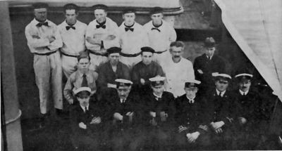 Fremsta röð frá vinstri: 1. Jón ; 2. vélstjóri; 2. Guðbjartur Guðbjartsson, 1. vélstjóri; 3. Jóhann P. Jónsson, skipherra; 4. Friðrik V. Ólafsson, 1, stýrimaður; 5. Einar M. Einarsson, 2. stýrimaður; 6. Lundquist „kanoner“ (Hann kenndi að nota fallbyssuna).