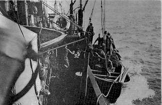 Á togaranum Hilmi sumarið 1937. Nótabátunum „slakað“ í sjó.