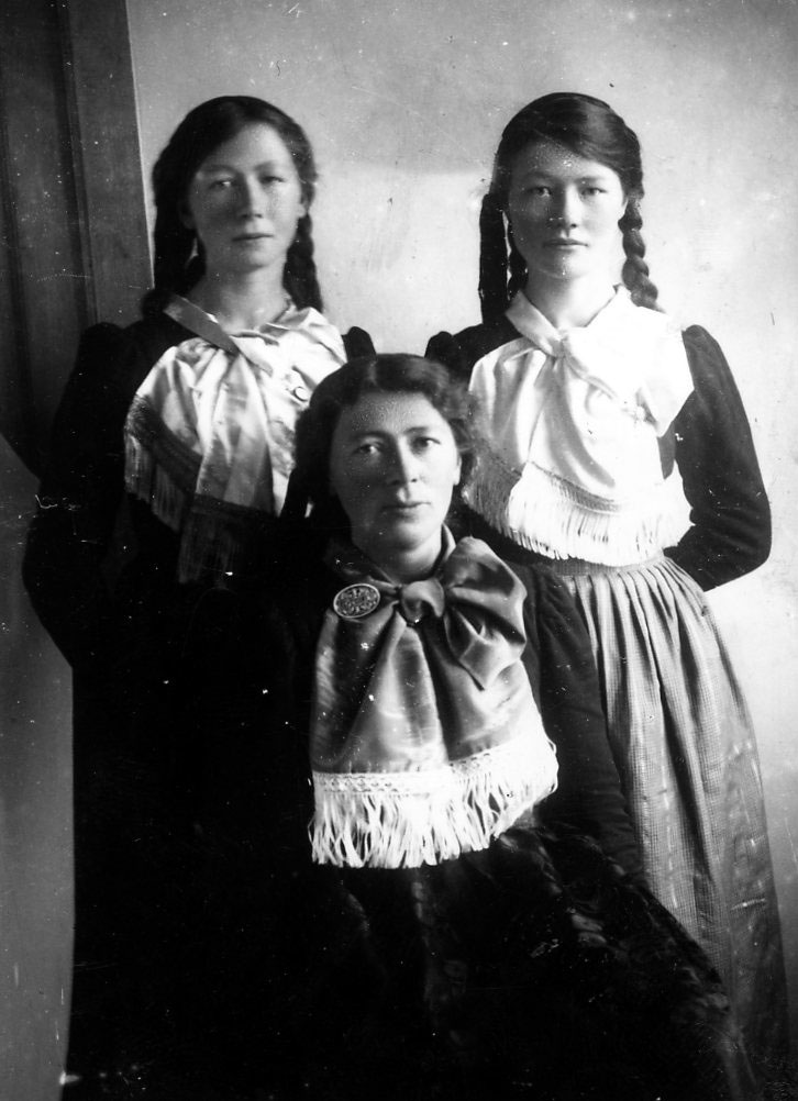 Frá v. ?, Pálína Eiríksdóttir frá Varmahlíð v/ Miðstræti og sú sem situr Ragnhildur Steingrímsdóttir frá Rauðabergi 1916.
