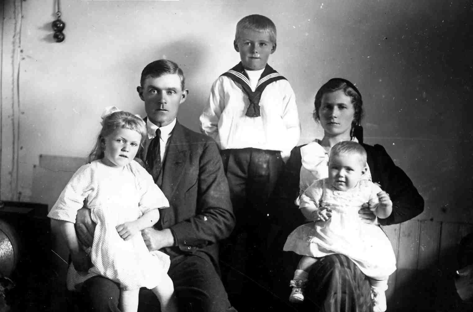 Eyvindur Þórarinsson, k. h. Sigurlilja Sigurðardóttir og börn, frá v. Guðný Laufey Eyvindsdóttir, Guðfinna Sigurlilja Eyvindsdóttir (Stella) og Elías Eyvindsson læknir, stendur.
