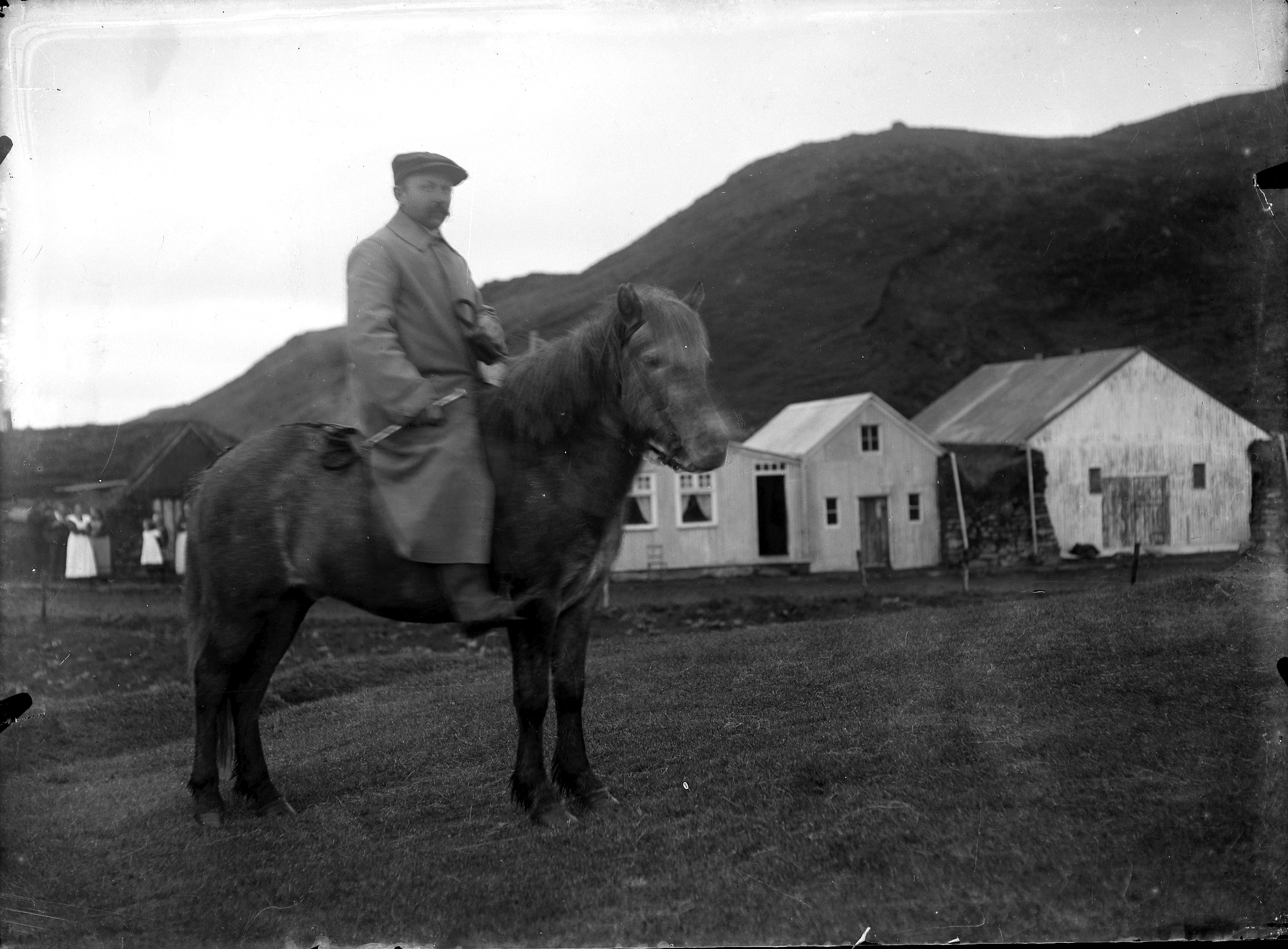 Óþekktur maður á hesti og sveitabær og fólk ??
