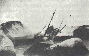 Þessar vörur eru þarna djúpt grafnar í sandinn undir öruggri gæzlu Ægis konungs, því eftir stuttan tíma var skip þetta sokkið, svo að um vorið sást aðeins framhnýfill þess upp úr sandinum.