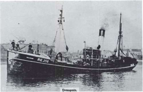 Fyrirtækið Draupnir h.f. var skrásett í Vestmannaeyjum 9. febrúar 1920, og kom togarinn „Draupnir“ til landsins rúmum mánuði síðar, eða 18. mars. Í þeim heimildum, sem ég hefi getað kannað, sést ekki, hvar togarinn hefur verið skráður, hvort það var Í Vestmannaeyjum eða Reykjavík, en þegar ég sé hans fyrst getið, ber hann einkennisstafina R.E. 258, og bar þá til „dánardægurs“.