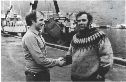 Mig grunar, að hinn þekkti bókaútgefandi og eigandi Þjóðsögu, Hafsteinn Guðmundsson sé höfundur þessa fallega merkis. Hann var alla tíð mikil hjálparhella við útgáfu Sjómannadagsblaðsins og frá 1957 til 1974 var Sjómannadagsblað Vestmannaeyja prentað í prentsmiðju Hafsteins og undir handarjaðri hans; fyrst í Hólum og síðar í Skarði á Seltjarnarnesi, breytt og smekklegra útlit og prentun blaðsins er fyrst og fremst hans verk. Hafsteinn er fæddur og uppalinn í Vestmannaeyjum og hefur alltaf hugsað hlýtt til Eyjanna, þó að nú sé orðið langt liðið síðan hann fór að heiman.