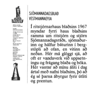 Á 16. árgangi Sjómannadagsblaðsins árið 1967 birtist nýr haus. Aðalmyndin var einstaklega skemmtileg og kröftug mynd af netadrætti, sem Jónas heitinn í Skuld hafði tekið um borð í Ófeigi III. hjá Óiafi bróður sínum. Hafsteinn Guðmundsson teiknaði og útfærði að vanda forsíðuna. Við nafn og árgang blaðsins, en ramma að neðan myndaði gömul miðamynd af Vestmannaeyjum teiknuð austan við Eyjar. Svo óheppilega vildi þó til í öllum flýtinum, sem alltaf var við útgáfu blaðsins, að klisju var snúið við í prentun, svo að mörgum fannst myndin nokkuð torkennileg, en héldu þá að þetta væru eyjarnar séðar vestan frá eða að þetta væri listrænt bragð! Á næstu forsíðu var þetta rétt og sáust þá útlínur eyjanna frá Súlnaskeri og að Hábarði á Ellirey. Þessi haus var á blaðinu næstu 3 árin, en þá man ég eftir, að kominn var nýr stíll á forsíðu blaða og tímarita. Ég vildi því breyta til og var forsíðan 1970 margar myndir úr lífi og starfi sjómanna, en rammi að ofan og neðan voru myndir af bátum á miðunum og á leið til hafnar, 5 bátar öslandi drekkhlaðnir á fullri ferð fyrir Klettinn á úthallandi vertíð. Hafsteinn útfærði að venju mínar hugdettur og raðaði þessu saman.