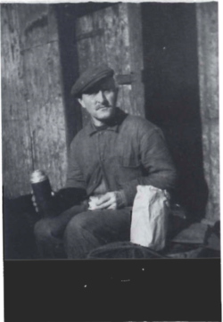 Eins og sjá má er kempan að drekka kaffisopann sinn, en það gerði hann okkur til samlætis, beitustrákunum á m/b Sleipni sem vorum hans næstu nágrannar þessa vertíð, 1947.