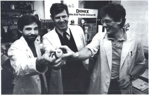 Dr. Bragi Ásgeirsson, dr. Jón Bragi Bjarnason og Ingólfur Kristjánsson hampa hér ensímsýni úr þorskaskúfum sem verið er að ganga frá til sendingar til Bandaríkjanna.