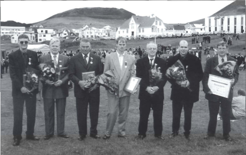 Ræðumaður dagsins var [[Jón Bondó Pálsson]] og var gerður góður rómur að ræðu hans.<br> | Ræðumaður dagsins var [[Jón Bondó Pálsson]] og var gerður góður rómur að ræðu hans.<br>[[Mynd:Þeir voru heiðraðir á sjómannadag, f.v. Gísli rímsson, Jóhann Björgvinsson, Guðmundur I. Guðmundsson, Pétur Árnmarsson, Sigmund Jóhannsson, Friðrik Vigfússon, Guðmundur Guðlaugsson.png|500px|center|thumb|Þeir voru heiðraðir á sjómannadag, f.v. Gísli rímsson, Jóhann Björgvinsson, Guðmundur I. Guðmundsson, Pétur Árnmarsson, Sigmund Jóhannsson, Friðrik Vigfússon, Guðmundur Guðlaugsson]] | ||