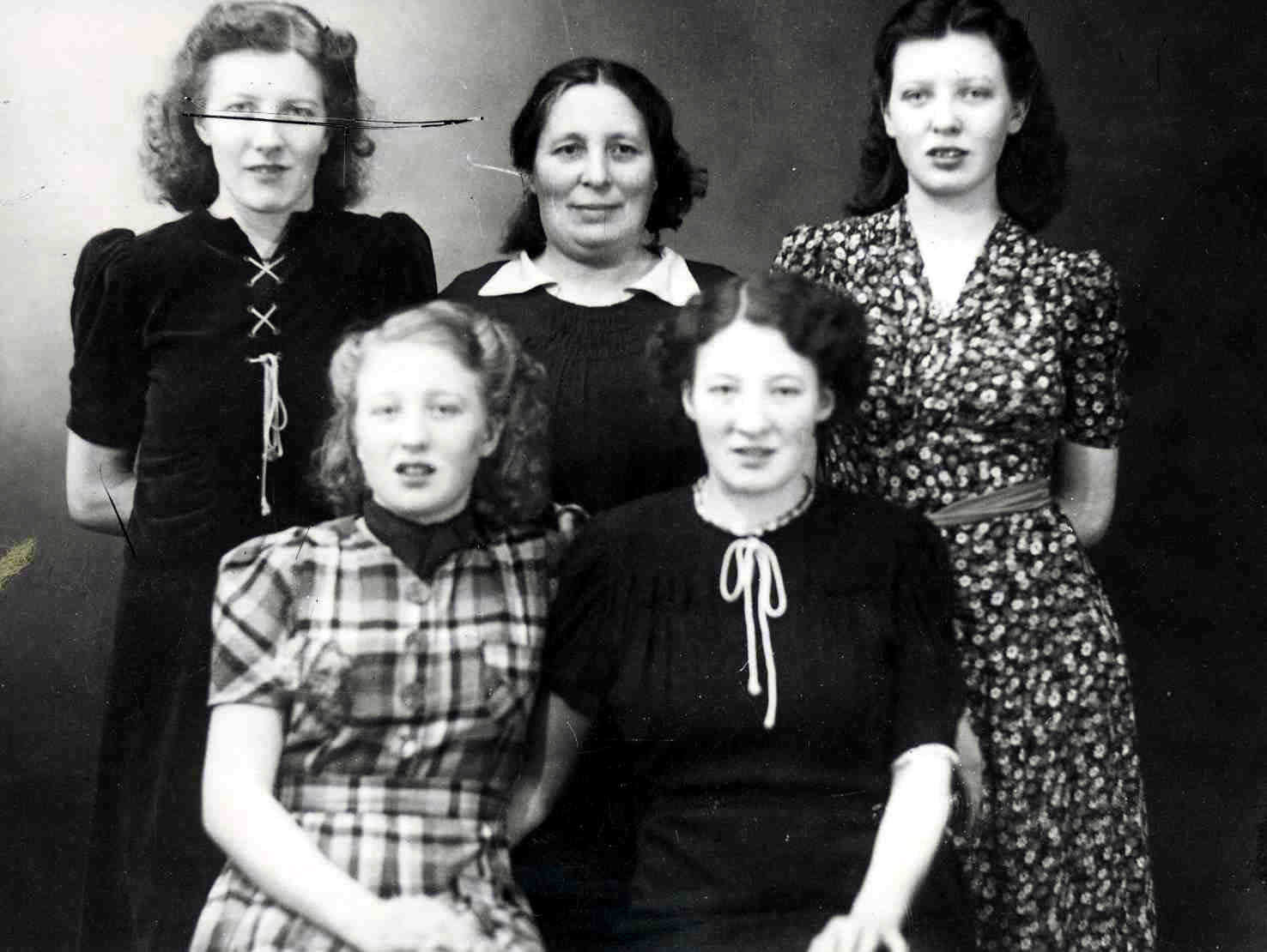 Frá. v. Björg Sigurjónsdóttir, Guðríður Þóroddsdóttir, Guðbjörg Sigurjónsdóttir. Sitjandi f.v. Þóra og Sigríður Sigurjónsdætur (Þóra var kona Óskars útgerðarmanns, átti m/b Leó og m/b Þórunni Sveinsdóttur Ve.)
