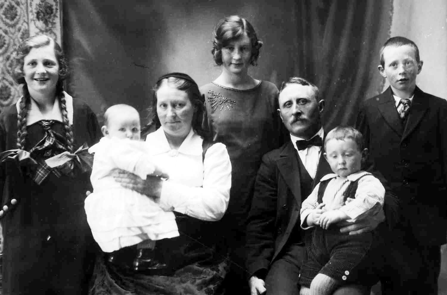 Gísli Jónsson frá Arnarhóli, Guðný Einarsdóttir og börn þeirra, aftari röð frá v. Guðný Svava Gísladóttir, Kristín Þyrí Gísladóttir, Guðný Einarsdóttir, Salóme Gísladóttir, Gísli Jónsson, Einar Jóhannes Gíslason og Óskar Magnús Gíslason.