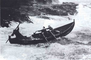 [[Mynd:Færeyskur bátur lendinguna Sdbl. 1990.jpg|miðja|thumb|Færeyskur bátur við lendinguna í Fugley sem er austust Færeyja og heyrir til „Norðureyjunum.“]] | |||