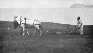 Þorbjörn bóndi plægir móa suðaustan við Helgafell. Enskur fuglafræðingur tók myndina árið 1935.