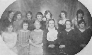 Fremri röð frá vinstri: Jónína Helgadóttir frá Dalbæ, Ásta Þorsteinsdóttir frá Laufási, Margrét Guðmundsdóttir frá Grafarholti, frú Matthildur Sveinsdóttir frá Akranesi, kennslukona í matreiðslu, Eva Andersen frá Sólbakka, Elín Jónsdóttir frá Ólafshúsum.