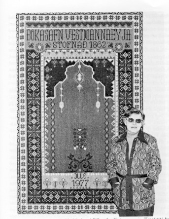 Þetta glœsilega veggteppi prýðir húsakynni Bókasafns Vestmannaeyja. Veggteppi þetta hefur kona bókavarðarins Haraldar Guðnasonar, frú Ille Guðnason, saumað og gefið Bókasafninu.