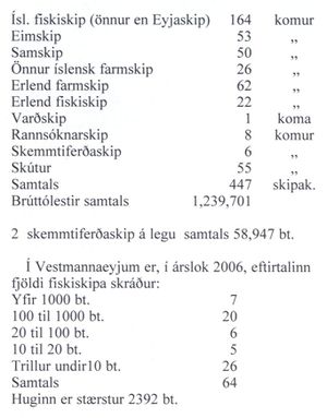 Að auki eru ferjan Herjólfur, 3354 bt., Lóðsinn, dráttarbátur, 156 bt. og Léttir hafnarbátur, 8,4 bt., skráð í Vestmannaeyjum.