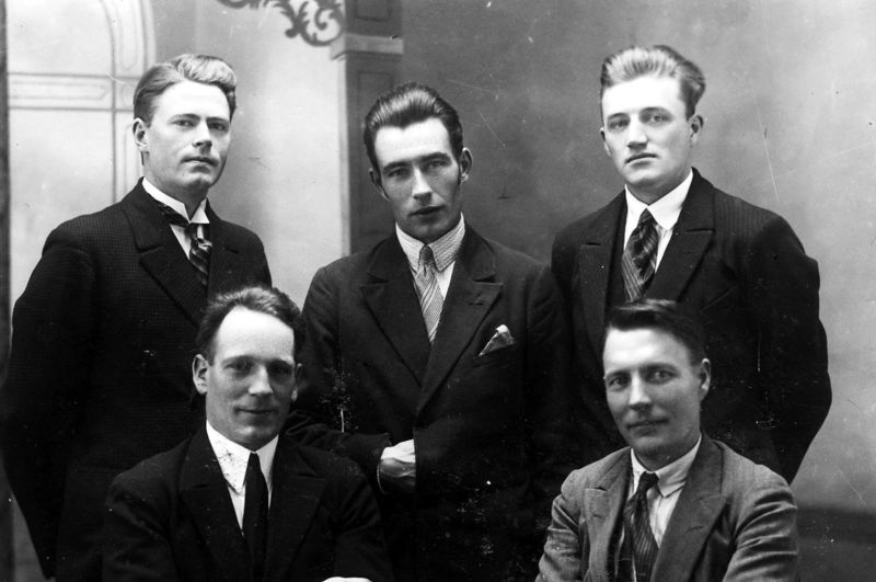 Kjartan Guðmundsson ljósmyndari frá Hörgsholti á Skólavegi fremst Fr.h. og Þóroddur Ólafsson frá Ekru v/ Urðaveg 20 og aftari röð fr.v. Óskar Þorláksson og Sigurður Jónsson frá Háagarði v/Austurveg og Páll Scheving frá Hjalla v/ Vestmannabraut 57