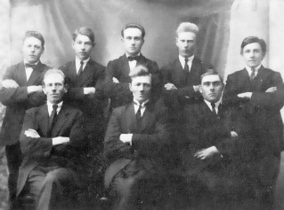 Aftari röð frá vinstri: Ólafur Tryggvason, Fáskrúðsfirði; Bóas Valdórsson, Reyðarfirði; Valdimar Tómasson, Vík í Mýrdal; Anton ?, Þykkvabæ; Ottó Guðmundur Vestmann, Fáskrúðsfirði; Kristján ?, Reykjavík; Jón Björnsson frá Gerði, Vm.; Ketill Brandsson, Hrútafellskoti undir Eyjafjöllum. —