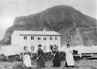 Íbúðarhúsið að Stakkagerði eystra. Húsið byggði Gísli gullsmiður árið 1899. Konurnar á myndinni eru þessar (talið frá vinstri): Guðbjörg kona Þorkels í Sandprýði, Theodóra Gísladóttir, elzta barn Stakkagerðishjóna, Jóhanna Árnadóttir, kona Gísla gullsmiðs; við vinstri öxl hennar sér á glugga í vinnustofu gullsmiðsins.