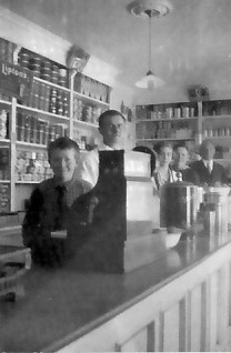 Brynjólfur Sigfússon lengst til hægri. Búðarmanninn Kristófer Guðjónsson frá Oddsstöðum ber yfir peningakassann á búðarborðinu.