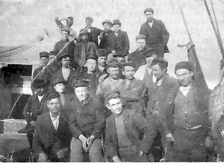 - Miðröð frá vinstri (12 menn): Ingimundur Jónsson, síðar til heimilis að Blómsturvöllum í Norðfirði, Einar Jónsson, ..., Einar Bjarnason, síðar formaður hjá Sigfúsi kaupmanni Sveinssyni á Nesi í Norðfirði. (Ég hitti Einar Bjarnason að máli á Nesi í Norðfirði árið 1971. Þá var hann 87 ára. Hann lézt tveim árum síðar, Þ. Þ. V.). ..., Ólafur Steinar Þorsteinsson frá Haga í Mjóafirði, ..., ..., ..., Sigurður Jónsson, síðar kenndur við heimili sitt Holt í Norðfirði. Nœstu tveir menn sjást illa á myndinni. Þetta munu hafa verið Norðmenn og vélamenn á skipinu.