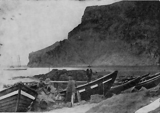 Austan við lágu klappirnar austur af Læknum reis Nausthamarinn, sem sést vel á þessari mynd. Efst á honum var grasi gróin torfa, sem móta sést fyrir á myndinni. Norðvestur af Nausthamri var klöppin Brúnkolla, sem einnig sést á myndinni. Hún ber undir skipið á höfninni. Eins og segir í greininni „Púað á loðinn ljóra“ hér í ritinu, þá byggði Gísli J. Johnsen bryggju sína norður með Nausthamri vestanverðum og varð Brúnkolla hausstœði hennar. Til þess að vélbátar gætu legið við þessa bryggju og upp með henni að vestanverðu, þurfti að sprengja og fjarlœgja miklar klappir, sem þar voru og nokkuð sést af á myndinni. — Bátarnir lengst til hœgri á þessari mynd eru settir upp í Fúlu, sem var uppsátur suður af Nausthamri eða milli Hamarsins og Strandvegar.